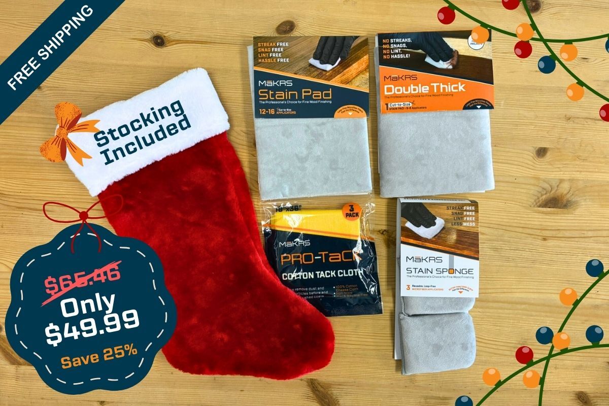 The perfect gift for any woodworker. This all-in-one gift stocking includes everything you need to tackle any finishing project with precision and ease. Bundle includes stocking, 1 Stain Pad Original (2-pack), 1 Stain Pad Double Thick (1-pack), 1 Stain Sponge (3-Pack), and 1 Pro-Tack Tack Cloth (3-Pack)